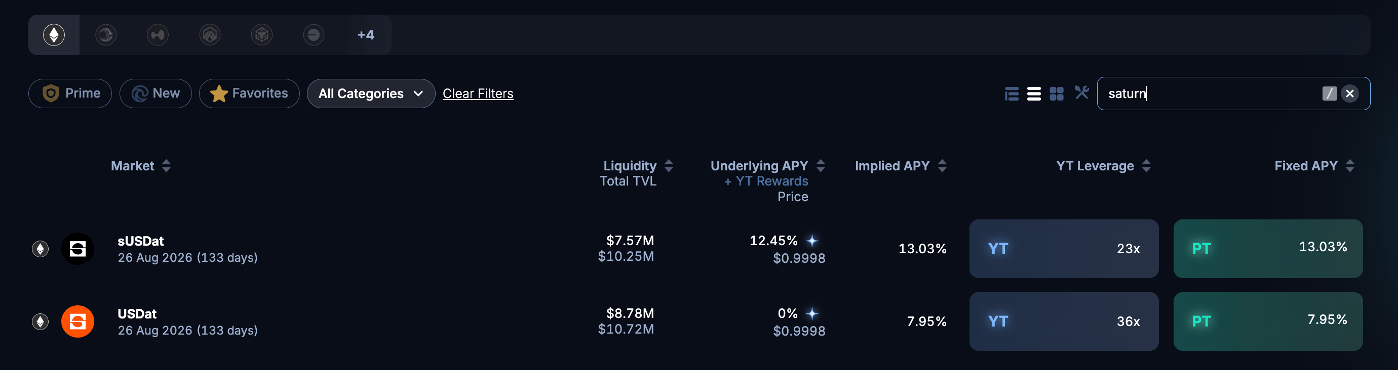 Saturn's two-token model uses USDat and sUSDat, bringing STRC onchain in a way that preserves the yield while unlocking everything DeFi does best. Hold sUSDat and you're earning STRC's dividend passively. Use it as collateral on Morpho and you can loop up to 4-6x. Trade the yield on their recently launched Pendle pools for USDat and sUSDat pools and you can take a view on where Saylor sets the dividend next. And through a future partnership with Strata, risk tranching will soon let users choose between a near-zero volatility senior tranche or a higher yield with the first-loss protection by the junior tranche.