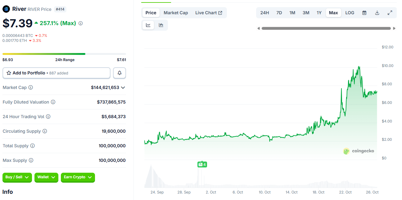 Since TGE on September 22, $RIVER has grown 5× and reached a new all-time high of $10 after listing on Binance Futures.
