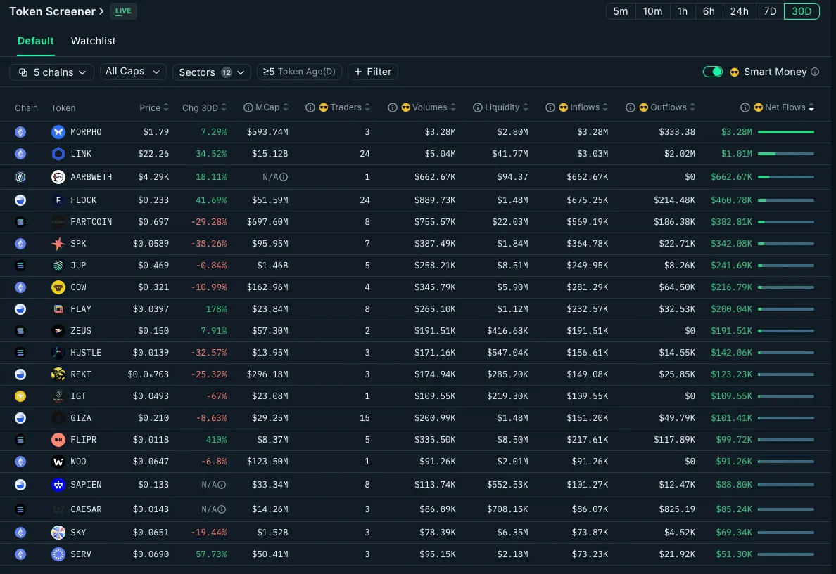 30D: $1.01M net flows, +34.52% balance change, 24 smart traders (broad institutional accumulation)