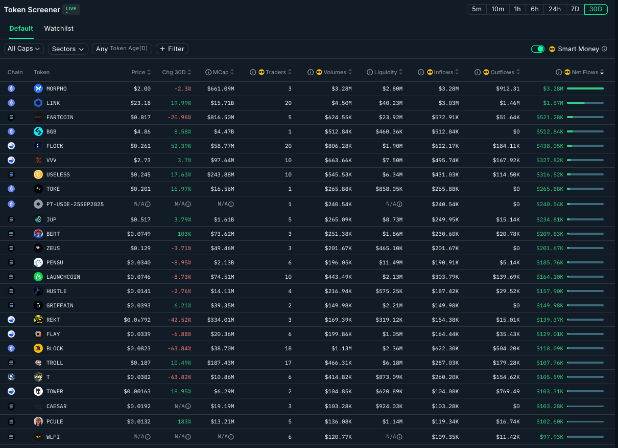 The following is a writeup by inPlanB on what he’s seeing recently with 24HR, 7D and 30D Smart Money flows using Nansen