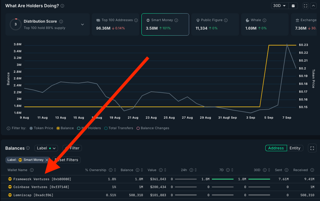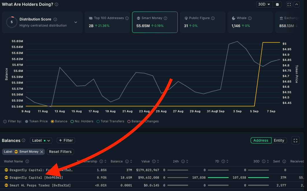 What this pattern tells us: When a single SM address deploys over half a million dollars in a concentrated timeframe, we're likely looking at an institutional fund. In this case, Dragonfly Capital. This isn't random speculation - they did serious due diligence and decided this deserved a meaningful position size. As you can in the image below, they actually added more to their previous position.