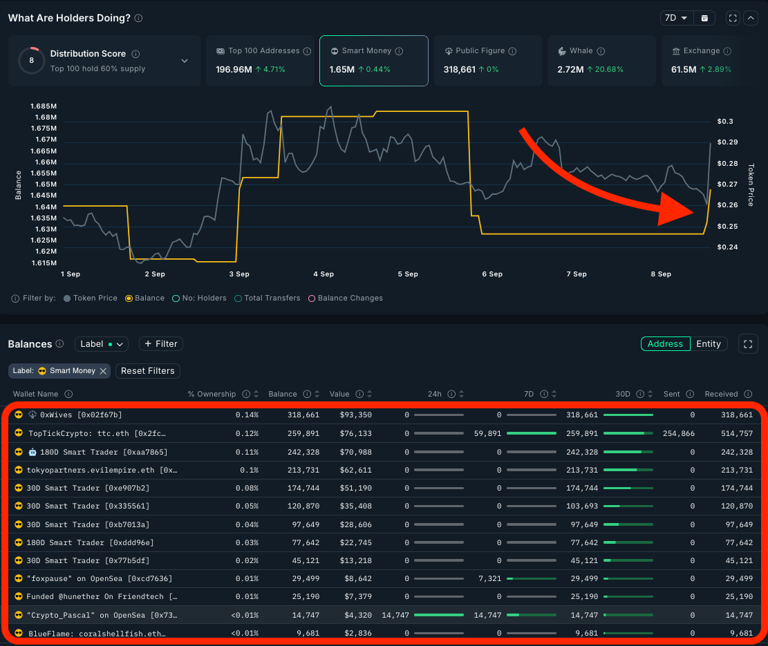 Pattern Analysis: $460.78K net flows from 24 different SM addresses over 30D with +41.69% balance change