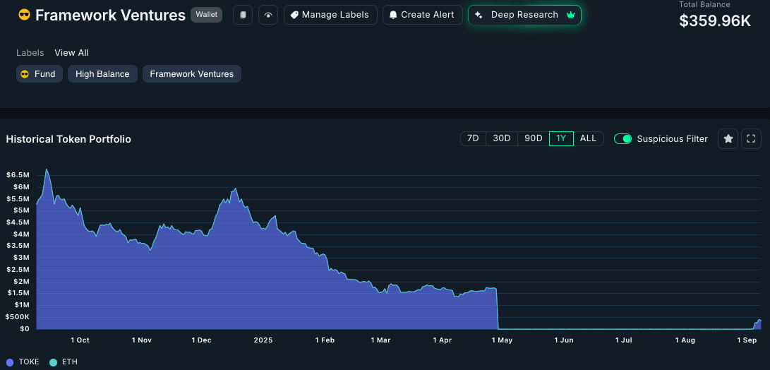The concentrated nature of this activity suggests early-mover conviction. Institutional players who specialize in spotting underpriced DeFi infrastructure tend to move quickly when the risk-adjusted setup is compelling. In this case, the player is Framework Ventures. What’s important to understand is that Framework once held a very large position in TOKE, but back in May they transferred all of it to FalconX to be sold systematically (we wrote about this happening under “Tokemak” section in Tokens on our Radar piece). What looks like them “coming back” is actually more nuanced: some of that inventory now appears to have been returned to their address.