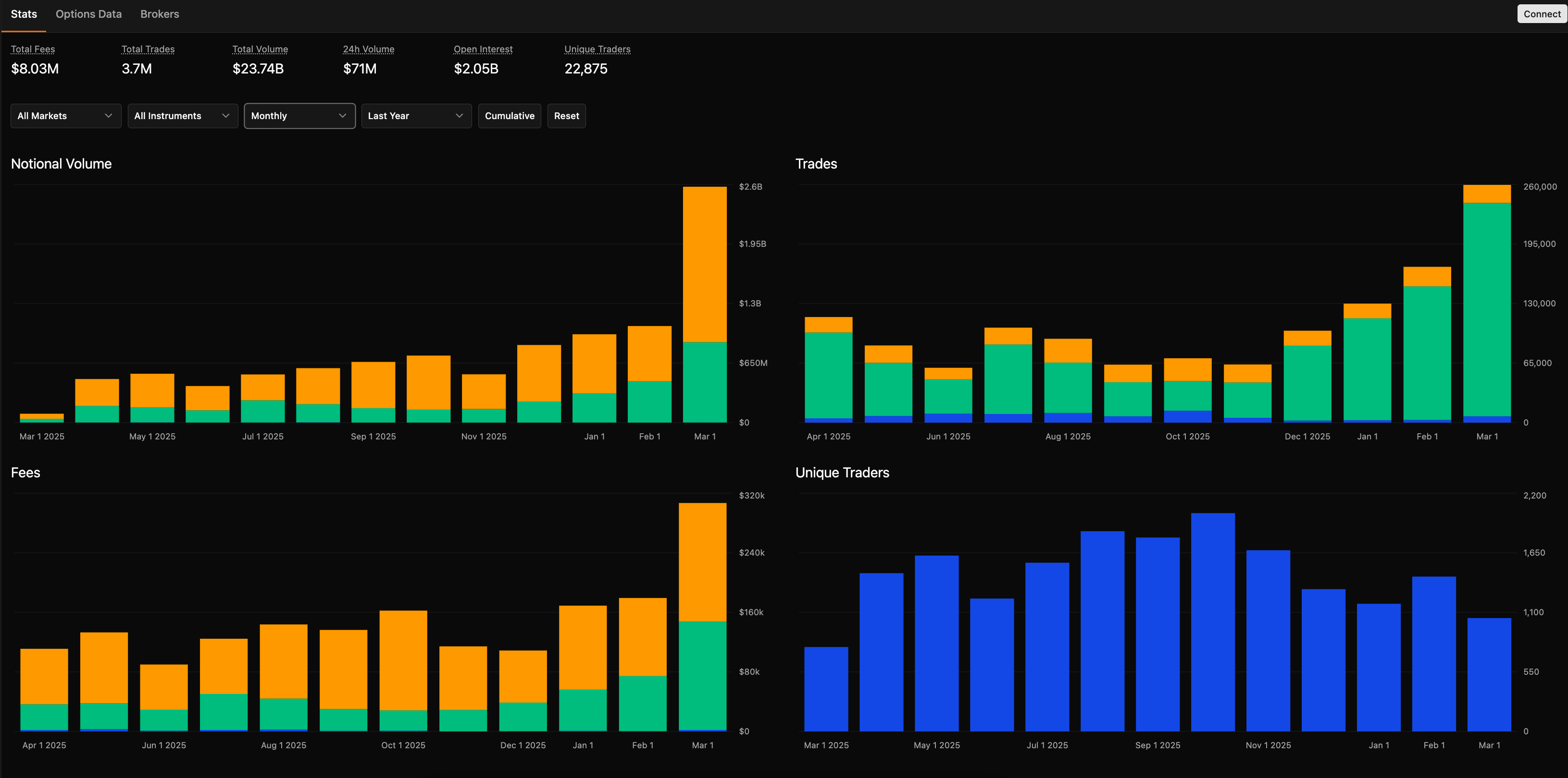 The market is littered with graveyards of protocols that took the easy path, pivoting away from options. According to Nick, their edge is doing the difficult thing that takes years and becomes incredibly difficult to replicate after the fact. Just look at their growth in trading volume and fees below.