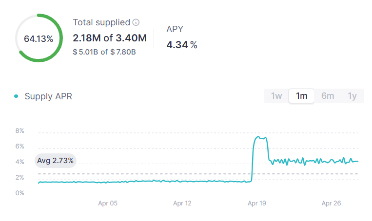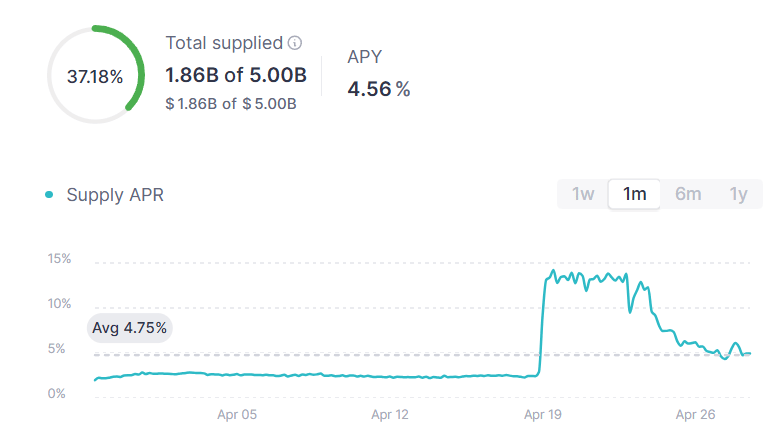 USDC 30 day benchmark rate on Aave: 4.56% (up from 2.30% last week)