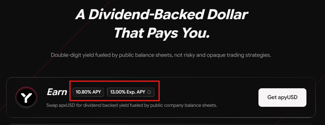 Users deposit apxUSD into a permissionless vault and receive apyUSD in return. Token balances do not rebase. Instead, yield accrues through a gradually increasing exchange rate, meaning each apyUSD can be redeemed for more apxUSD over time.