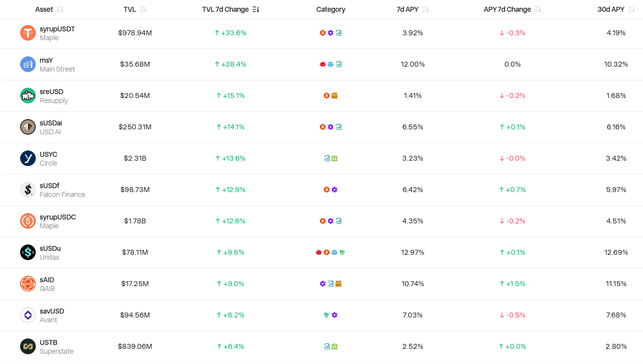This week the top movers were: Maple (syrupUSDT) +33.6%, Main Street (msY) +28.4%, Resupply (sreUSD) +15.1%.