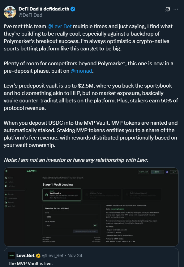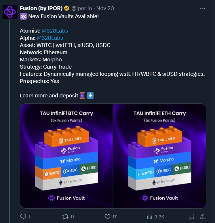 I’ve talked at length with the TAU Labs team and Ipor Fusion team. I had the opportunity to get an in-depth product demo on the Fusion vaults from their team and came away extremely impressed. I’ve also heard very good things from builders I trust that are working directly with the Fusion product.