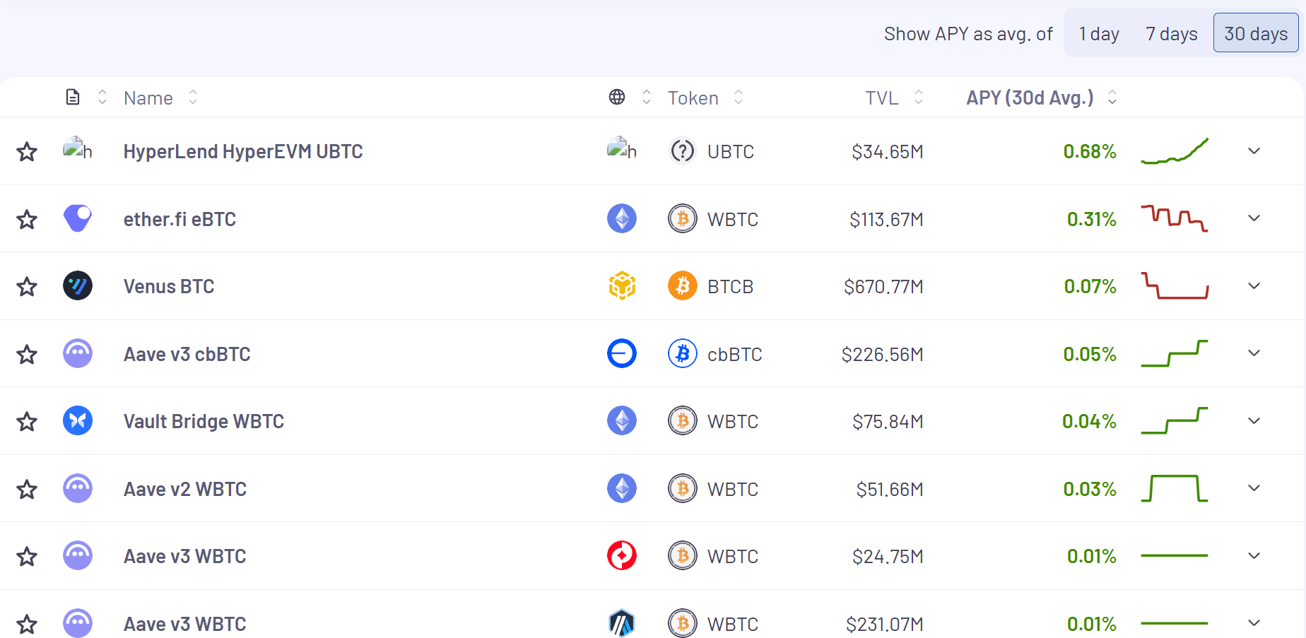 Here’s the top yielding BTC vaults (real yields) for the past 30 days according to Vaults.fyi: