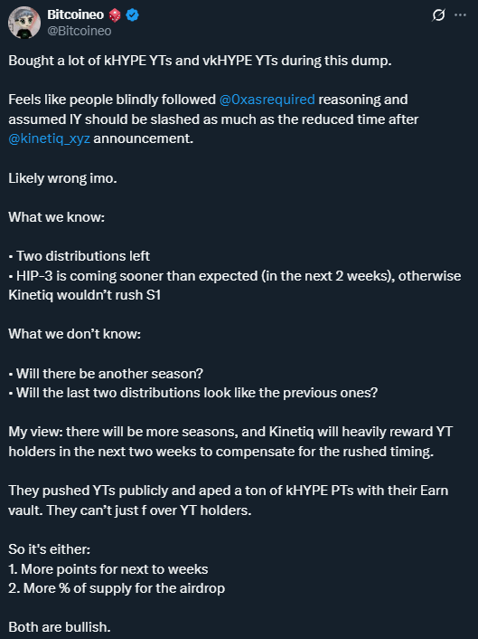 I bought a little bit more kHYPE YTs at around 6.8% IY, but missed the really good dip early morning on September 29th. I like Bitcoineo’s breakdown posted below: