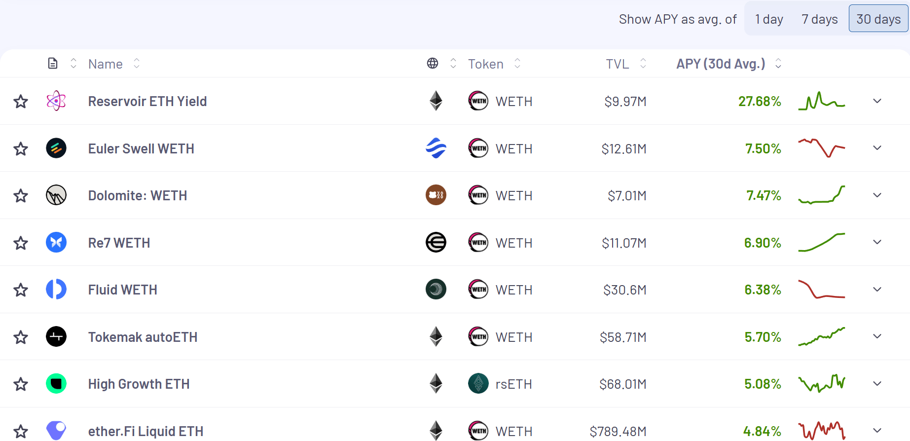 Here’s the top yielding ETH vaults (boosted) for the past 30 days according to Vaults.fyi: