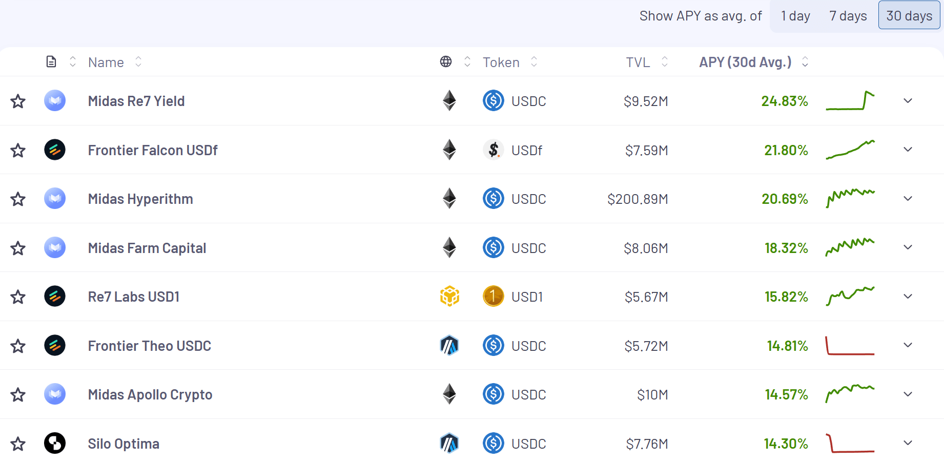 Here’s the top yielding stablecoin vaults (boosted) for the past 30 days according to Vaults.fyi: