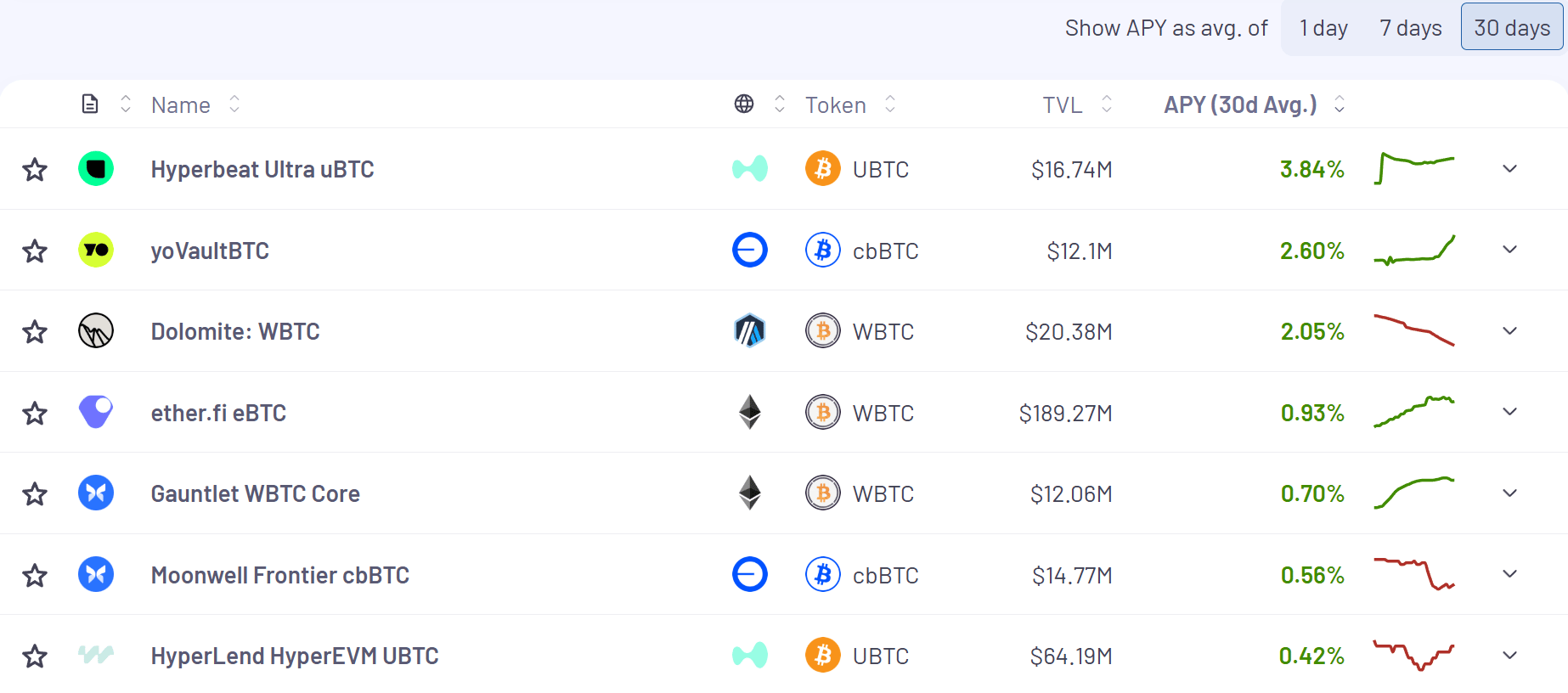 Here’s the top yielding BTC vaults (boosted) for the past 30 days according to Vaults.fyi: