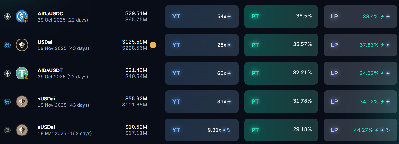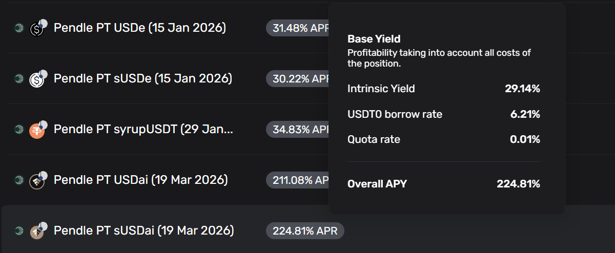 OK, check out these USD.ai PT loops below. I didn’t even know they had March 19 2026 PTs up, but this is wild - they are showing up to 224.81% APR (I actually need to ping the team and make sure this is right 😂) :