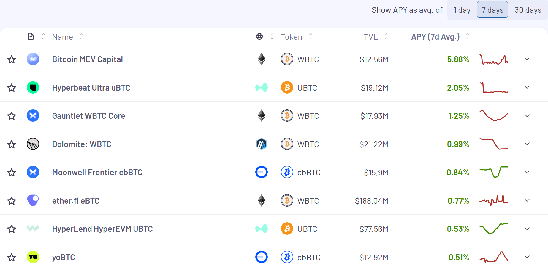 Here’s the top yielding BTC vaults (boosted) for the past 7 days according to Vaults.fyi: