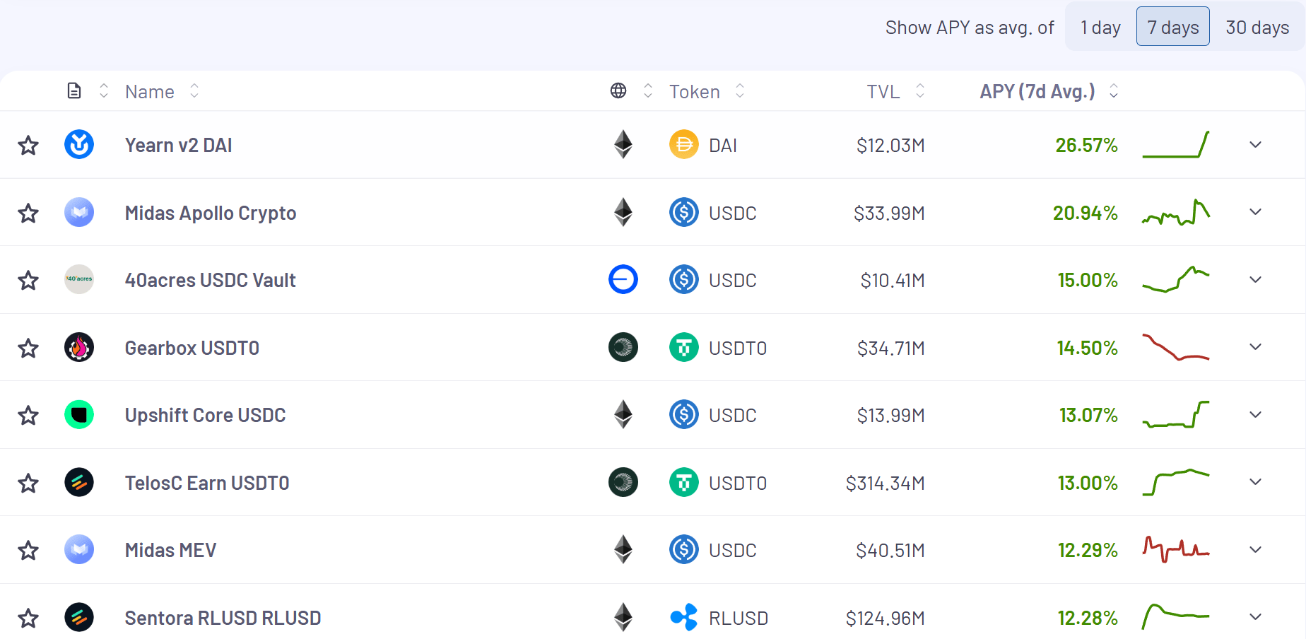Here’s the top yielding stablecoin vaults (boosted) for the past 7 days according to Vaults.fyi: