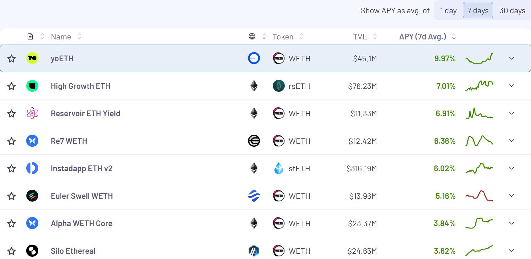 Here’s the top yielding ETH vaults (boosted) for the past 7 days according to Vaults.fyi: