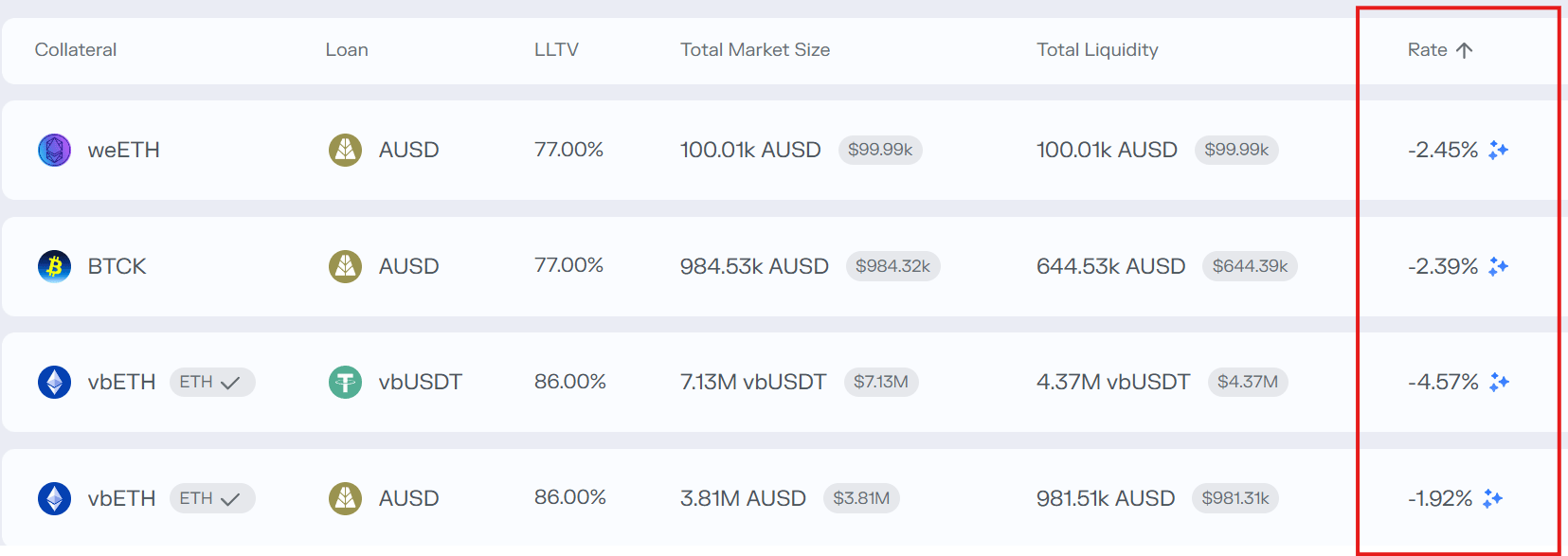 As of right now, most of their primary collateral markets are paying you to borrow stables against them. Yes, you read that right, not only is borrowing free, you’re getting paid to do it. As you can see below this is ranging from -1.92% to -4.57%: